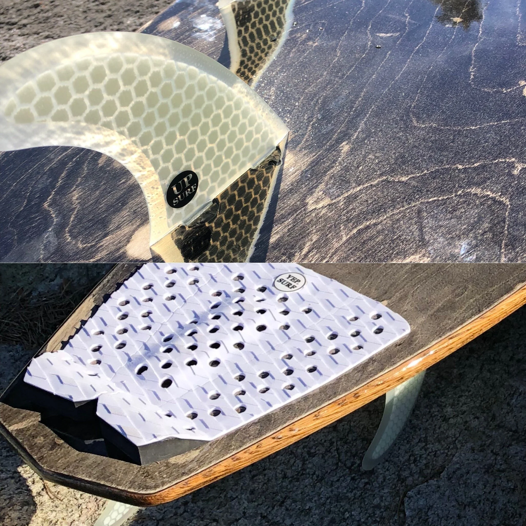 The wave surfboard measures 160 cm in length and 52 cm in width at waist. The thickness of the board varies from tip to tail and it has a volume of about 12 liters. This one features oak edges and custom tip and comes with tail pad and inserts for three FCS1 fins. It weighs 3850 grams without tail pad and fins.